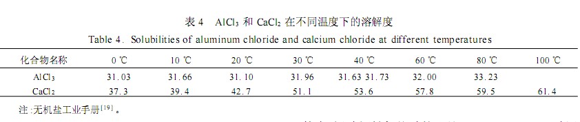 固定浸出时间为 1 h、原料配比(g∶mL) :1∶6.5为情况下 ,考虑浸出温度对Al2O3浸出率的影响(表 2 中方案 7、8、9)。结果表明浸出率随酸溶温度的升高而增大 ,但当酸溶温度大于 70~75 ℃时 ,Al2O3 浸出率并无显著增加;另外 ,盐酸属于易挥发对实验方案 1、5、8 的浸出液中Al2O3含量、CaO 含量进行了分析。结果见表 3 ,在各种浸出条件下 ,浸出液中钙含量比铝含量低。而在较高温度时氯化钙在水中溶解度大于三氯化铝(见表 4 ),因此在浓缩前期 ,由于 CaCl 2未达到饱和度仍会大量残留于母液中。基于此 ,我们对方案 8 的浸出液采取分步浓缩结晶工艺 ,将浸出液加热至 60 ℃进行恒温蒸发结晶 ,当浸出液浓缩至~280 mL 时 ,将析出的 AlCl 3 ·6H 2O 和母液趁热分离。所获得浅黄色结晶氯化铝样品 213 g , 其析出率大于 90 %。经分析样品中AlCl 3 ·6H 2O ≥90 %、Fe ≤0. 26 %,达到了水处理剂结晶氯化铝的国家标准要求。