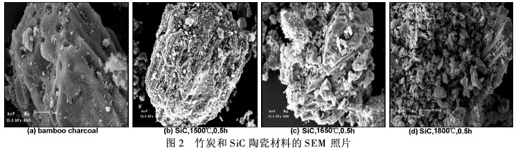 将竹炭和竹炭基SiC陶瓷材料等4个干燥试样在玛瑙研钵中研磨,经压片后,在荷兰Philips-FEI公司Quanta200型环境扫描电镜下进行观察,所得照片如图2所示。