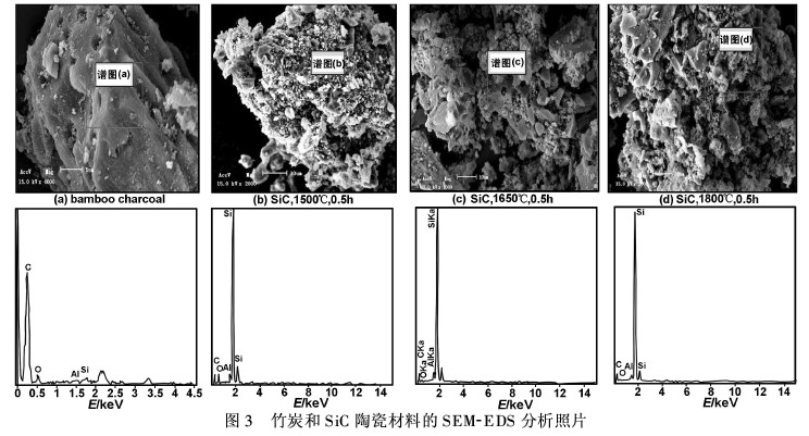 由图3可以看出,通过对竹炭和不同温度下制备的SiC陶瓷材料的不同区域进行SEM-EDS分析,元素C、O、Si、Al在样品表面呈现有规律的变化。竹炭外表面主要含有C、O、Si、Al等元素(因采用EDS结果,不能测得H含量),而且C元素所占比例最大,其中Si、Al等元素是竹炭灰分的主要来源。谱图(b)、 (c)、(d)中的元素变化,主要表现为C、Al元素基本不变,O元素逐渐减少,Si元素逐渐增多,可以推测出C元素在达到1500℃时就已经趋于稳定,且反应完全, Al元素来自竹炭,基本保持不变,而O、Si元素的变化较大,且呈现此消彼长的趋势,说明化学键的变化主要是C—O键→C—Si键的转化,与FTIR中得出的推测是一致的。由此也可以得出,SiC陶瓷是一种复相陶瓷,包括微量残C和游离态的Si在里面。