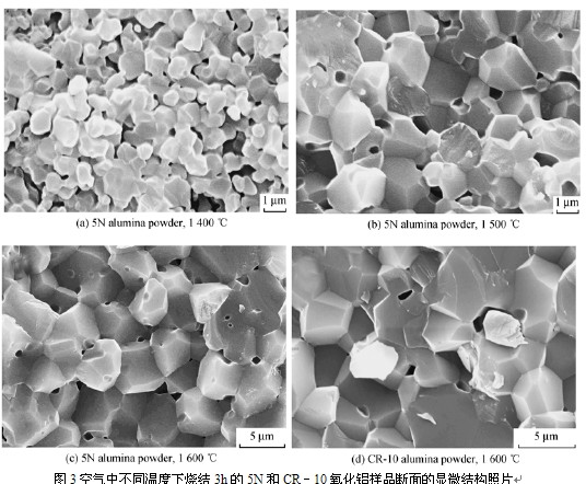 表2为5N氧化铝粉体球磨前后以及CR–10氧化铝粉体中位粒径和比表面积。从表2可以看出:球磨3h后的5N氧化铝粉体的中位粒径D50由4.68μm减小到1.09μm,比表面积由1.81 m2/g增加到7.47 m2/g,接近于CR–10氧化铝粉体的指标。图1为球磨后5N氧化铝粉体与CR–10氧化铝粉体的粒度分布曲线,两曲线都呈单峰分布,粒径的分布范围也相当一致。