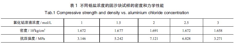 为了研究铝盐固化剂浓度对固沙体力学性能的影响,我们将不同浓度铝盐固化剂制备出的固沙块试样密度和力学性能实验结果列于表1。