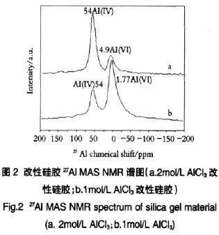 改性硅胶材料的27Al MAS NMR 谱如图2 所示。首先将两种经不同浓度铝盐溶液固化的铝改性硅胶试样27Al MAS NMR 谱进行比较发现:1mol/L 氯化铝固化铝改性硅胶主峰出现在1.77ppm 处,归属于VI 配位(八面体骨架);弱峰出现于54ppm 处,属IV配位(四面体骨架),说明以八面体结构为主要骨架结构。2mol/L 氯化铝固化铝改性硅胶主峰则出现54ppm 处,而弱峰出现在4.9ppm 处,说明其构架以IV 配位为主,仍有VI 配位存在。即随着氯化铝溶液浓度的增大,化学位移向化学位移小的方向移动, 54ppm 附近的共振峰表明更多的Al3+ 与[SiO4]连接或者Si4+ 被Al3+ 取代,形成了更多的铝氧VI 配位体。