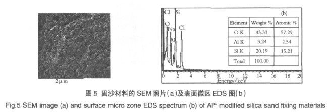 图5 为铝改性硅胶固沙块试样的截面SEM 照片(a)及表面微区EDS 图(b)。由图5(a)看出铝改性硅胶较好地包裹于沙粒表面并填充沙粒空隙。由于固化反应是在沙粒间及其表面上就地生成,因此铝改性硅胶在沙粒间起到较好的粘结作用。对铝改性硅胶材料中表面微区进行X 射线能谱分析(EDS),可直接的反映出铝改性硅胶中Al3+ 存在与含量,从图5(b)可以