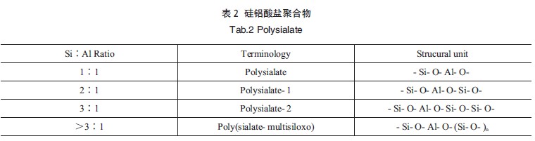 Davidovits 发现原子比Si∶Al 不同时,形成的硅铝酸盐结构也是不同的。其对应的硅铝酸盐聚合物名称和结构单元如表2 所示。