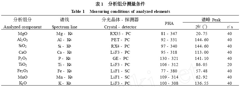 高温马弗炉 ; R IX 3000 型 X 射线荧光光谱仪 (日本理学) ,端窗 , Rh 靶 ;样品盒面罩孔径为φ30 mm ; X 射线管工作电流 -  电压除 MnO , K2 O , P2 O5 为 50 kV - 55 mA 外 ,其余元素均为 50 kV- 50 mA ;准直器为粗狭缝 (coarse) 。分析元素谱线及其它测量条件列于表 1 。