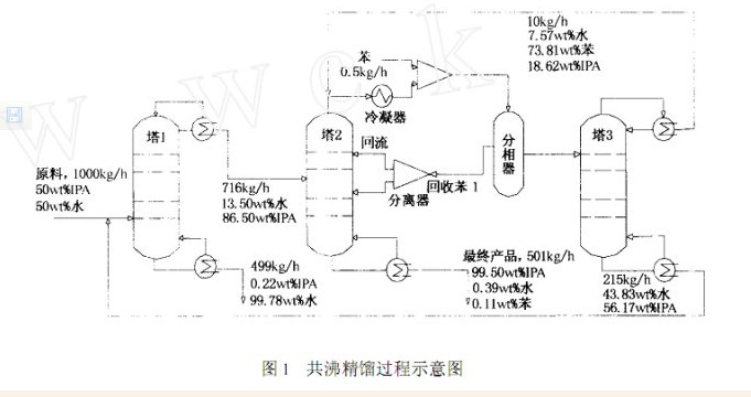 此法工艺较成熟 , 但是共沸精馏设备投资大 , 能耗高 , 且由于苯的使用对操作人员的身体有害 , 故将逐渐被绿色环保的新工艺所取代。