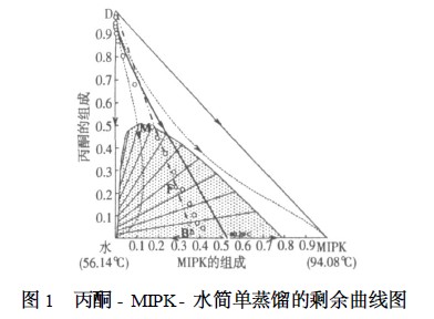 丙酮、MIPK、水三元物系组成的剩余曲线图的形式如图1 和图2 所示 ,常压下该物系只有一个共沸物即MIPK与水形成的共沸物存在,共沸点为 80.29 ℃,图中的组成为摩尔分率。丙酮点与共沸点间连接的实线将剩余曲线图分成不同蒸馏区域,称为蒸馏边界线,在不同的蒸馏区域进行精馏可以得到不同的产品;图中的虚线就是剩余曲线,是指无回流简单蒸馏过程中塔釜浓度随时间变化的轨迹。剩余曲线具有方向性 ,由于箭头指向温度增加的方向 ,即由低沸点出发到高沸点终止 ,所以剩余曲线的起点对应该区域内沸点最低点 ,也叫不稳定节点(图中丙酮点);终点是所在区域内的沸点最高点 ,也叫稳定节点(图中水点和MIPK点 ;而将既有箭头指向、又有箭头背离的具有中间温度的点称为鞍点(图中共沸点)。在同一蒸馏区域内 ,剩余曲线仅连接一个稳定节点和一个不稳定节点 ,除稳定节点和不稳定节点外 ,剩余曲线既不能彼此相交 ,也不能穿过蒸馏边界 ,每个蒸馏区域中的所有剩余曲线都具有相同的起点和终点。只有当某一剩余曲线连接所希望得到的产品时 ,一个均相共沸物才有可能被分离成接近纯的组分。图中丙酮点、MIPK点、水点均为节点 ,且丙酮的沸点最低 ,因此可以通过简单蒸馏在塔顶得到纯丙酮。