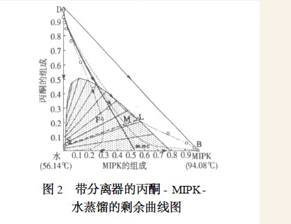 建立丙酮、MIPK、水三元物系分离的简单蒸馏塔,即只有一个进料、一个塔顶出料和一个塔釜出料,要求在塔顶得到质量纯度为99.5 %的丙酮 ,其蒸馏过程可以在剩余曲线图上表示,如图1。图中 F点是进料组成所表示的点,D点是塔顶产品组成,B点是塔釜产品组成, M点是进料板液相组成, F、D、B 在一条直线上表示进料与产品物料平衡。D 与M连接的穿过圆圈标记的实线是精馏段浓度轮廓线 ,B 与 M连接的穿过圆圈标记的实线是提馏段浓度轮廓线 ,此时塔釜物料的质量组成水:0.255、丙酮:0.031、MIPK:0.715。该简单蒸馏表明整个蒸馏过程在剩余曲线图左边的蒸馏区域进行 ,不能跨越蒸馏边界。图中阴影部分表示水与MIPK的部分互溶区域,互溶区域边界连线的直线是液-液相平衡线。从图中可以看出 ,液-液相平衡线能够穿越蒸馏边界线 ,因此只要选择适宜组成的精馏塔侧线采出 ,就可以通过液-液分层跨越蒸馏边界实现脱水 ,从而达到在一个塔中既能够得到丙酮产品 ,又能够实现脱水 ,在塔釜得到MIPK产品的目的。