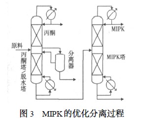 甲基异丙基酮生产中酮化液的主要成分有丙酮、水、甲基异丙基酮、二异丙基酮(DIPK)及异丁酸(ISOBACID ),分离要求是:质量分率为 99.5 %的丙酮作为原料回到反应系统,质量分率为 99.0 %的甲基异丙基酮作为产品。目前的分离方式一般是先用一个精馏塔(丙酮塔)在塔顶将丙酮分离出去,然后用一个精馏塔(脱水塔)在塔顶将水脱除掉 ,最后在另一个精馏塔(MIPK塔)的塔顶得到MIPK产品 。