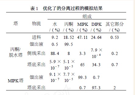 按照分离要求在Aspen PLUS中建立了图 3 所示流程的模拟模型 ,计算结果见表 1(质量分率)。从表中可以看出 ,在丙酮/脱水塔塔顶能够得到质量分率大于99.5 %的丙酮 ,在MIPK塔顶可以得到质量分率大于99.0 %的甲基异丙基酮产品 ,说明用这样一种设备就可以实现丙酮和水的同时脱除。
