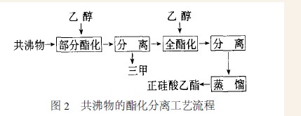 酯化分离法是通过向共沸物滴加乙醇, 使乙醇首先与活性较高的四氯化硅反应, 破坏两组分的共沸, 从而实现三甲基氯硅烷和四氯化硅部分酯化物分离的方法。共沸物的酯化分离工艺流程见图2 。