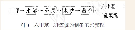 六甲基二硅氧烷主要用作二甲基硅油和含氢硅油的封头剂, 也是制备MQ 树脂的主要原料,进一步加工可制成有机硅系列压敏胶。六甲基二硅氧烷的制备工艺流程如图3 所示。