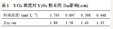 为保证稀土离子沉淀完全,需控制PH = 6~7 。因此,我们选用氨水稍过量,一是保证Y3+ 完全转化为Y(OH)3;二是使剩余OH- 不可过量太多,以免消耗H2C2O4 用量。试验结果表明,在选定YCl3浓度0. 4~1. 8 mol·L - 1 , 选择氨水浓度3. 0~15. 0mol·L - 1所获得Y2O3 粉末粒径在1~2μm 之间。见表2 。