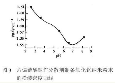 从图中可以看出,在pH值介于6~7时所得的粉末的松装密度较小,且有一个最低点。即此时制得的粉末产品的粒度最小,所以pH值控制在6~7为最好。