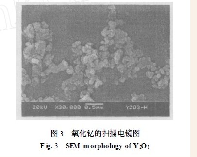用JSM - 5900LV 扫描电镜对氧化钇进行形貌观察,如图3 所示,采用室温球磨固相反应法制得的氧化钇以球形为主,颗粒分布均匀,达到纳米尺度。
