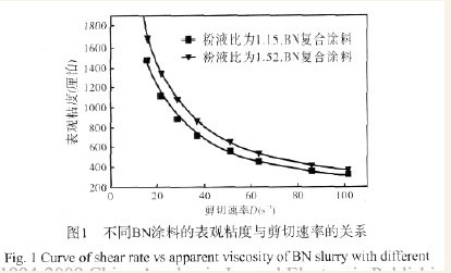 ( 1) 普通氮化硼粉体由于比表面积大、流动性差,无法用在熔模精密铸造涂料中。但通过对普通氮化硼粉体的预活化处理来改变其颗粒表面特性与形貌,使得氮化硼颗粒可用于涂料中。加入一定量氧化钇,可在保证一定粘度情况下,大幅度提高涂料中固相含量,从而提高型壳表面致密度。氮化硼涂料具有剪切稀释性,涂料表观粘度随剪切速率升高而降低。