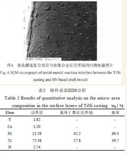 从铸件表面可看到,由氮化硼基复合型壳在1600 ℃浇注的钛合金铸件表面光洁,仅有少量粘砂。图4为氮化硼基复合型壳中铸造出的钛铸件经线切割的垂直界面扫描电镜照片,从图4可看出氮化硼复合型壳制备的钛铸件反应层仅几微米,铸件中也没有出现氧化钇(撒砂用)夹杂物。这从一方面,证明了氮化硼基复合型壳具有很高耐火度,且和钛合金熔体反应的程度也较低。一般来讲,界面反应会导致表面层钛合金的氮硼含量发生变化,从而造成表面层钛合金相变,形成与基体有较大差异的相,出现分层界面。通过表2可知,在铸件表面边界层没有检测出B,而主要是Ti、Ni和少量的Y、N、Ca,边界层中的Ni含量和靠近边界处基体Ni的含量低于基体中Ni含量。说明边界反应层的出现主要是由于Ti与型壳材料的反应,而非TiNi整体与型壳的反应。