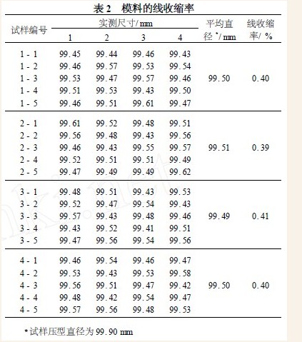 模料热胀冷缩小,可以提高熔模的尺寸精度,也有利于减少模料的表面缺陷,减少脱蜡时胀裂型壳的可能性。所以,收缩率小是模料最重要的性能要求,模料收缩率一般应小于0. 7 %。本课题研究的模料的收缩率见表2。由表2 可知:本模料的线收缩率< 0. 5 %,达到了钛合金精密铸造对模料线收缩率的要求。