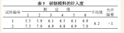 为保持熔模表面光滑,其表面应有足够的硬度,以防摩擦损伤。表面硬度通常以针入度表示,优质模料的表面硬度多在5°~7°范围,模料太硬修饰性差,容易发脆。针入度按HB5350. 4 - 86《熔模铸造模料表面硬度测定方法》进行,测定试样温度为20 ℃,加载负荷100 g,5 s内标准针沿垂直方向插入模料的深度以0. 1mm 计,结果见表5。