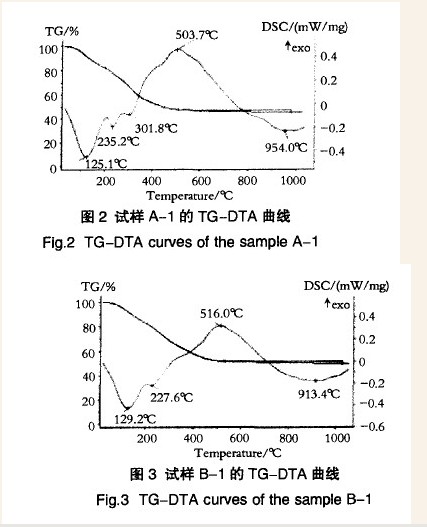 对试样A—l和B—l进行TG-DTA分析,结果如图2和图3所示。试样的测试温度范围为20~1100℃,升温速率为30℃/min,质量损失数据如表3所示。