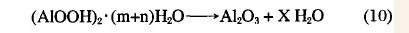 其中,m和n分别表示勃姆石表面的物理吸附水和化学吸附水的分子数,v是残留于过渡氧化铝里水的分子数。从表3中的质量损失,由: