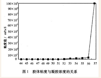 水溶性胶体的原料采用结晶氯化铝、醋酸、去离子水等,经过反应、过滤后形成主体为碱式氯化铝,浓缩后形成粘性水溶胶,溶胶特征为阳离子型无机高分子电解质,分子式为:Al2(OH)nC16-n,p<H7,呈弱酸生。所制成的水性溶胶体透明均匀,粘度随浓度的变化见图1,当“凝胶浓度”超过约56wt%后,溶胶粘度值急速增大。粘度的增大表明分子之间交联的增多,而曲线出现拐点现象,表明了水分子在一定含量上参与胶体聚合过程,无机高分子聚合物的结构具有半定量化学组成的可能。从图1的曲线变化可认为,浓度(水含量)是影响溶胶体粘度的主要因素。