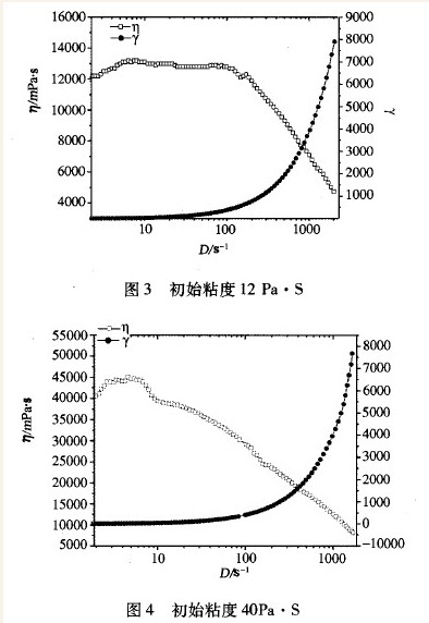 对胶体的应力应变特性进行了测定,可见本研究所涉及的水溶性胶体特征为切力变稀的假塑性流体。根据拉丝试验获得的结果,适宜拉丝的胶体粘度范围在(40~50)Pa·s。初始粘度的不同,粘度与应变关系的变化也不同。低粘度(图3)的曲线变化主要体现了水分子在应力环境下的作用,而高粘度胶体(图4、图5)的曲线变化体现出无机高分子应变的特点。图8的曲线体现出当应力速度达到一定值后,无机高分子在高的应力下大量的“解聚”,说明了水溶性无机高分子结构是分子问范德华力作用的特征。