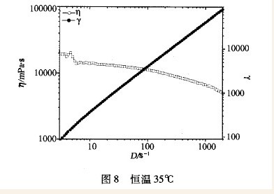 同一胶体不同温度下的应力应变特性见图7、图8,可见温度升高后,胶体特征仍为切力变稀。试验结果表明,在35℃下无机高分子的“解聚”作用已使胶体的流变特性发生了较大的变化,内聚力大大减弱,基本失去溶胶体初始的粘性流变特征。通过对该胶体成纤试验,在25℃时胶体拉丝性好于提高温度的拉丝性。