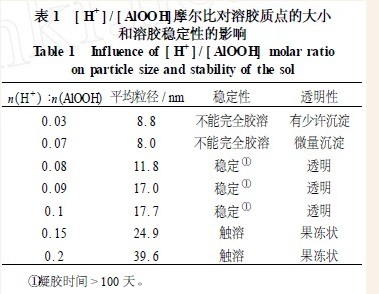在n(H+ )/ n(AlOOH)= 011 、胶解温度为80 ℃条件下,考察了SB 粉浓度对AlOOH 胶体的质点大小和溶胶稳定性的影响,结果见表2。