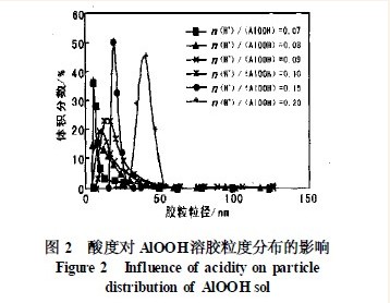 从表1 可以看出,在相同浓度条件下,胶体的酸度对胶体质点的平均粒径和稳定性均有影响。酸度增加,SB 粉的溶解度提高。AlOOH 溶胶质点的大小随着酸度的降低先呈下降趋势,之后很快上升。当n(H+ )/ n(AlOOH)< 0. 07 时,SB 粉不能完全胶溶,而当n(H+ )/ n (AlOOH)> 011 时,溶胶在2 天后凝胶化。酸度对AlOOH 溶胶粒度分布的影响见图2 。当n(H+ )/ n(AlOOH)= 0107 时,溶胶粒度分布最窄。从上述实验结果可知,利用SB 粉制备稳定的AlOOH 溶胶适宜的n(H+ )/ n(AlOOH)的范围在0108~011之间。