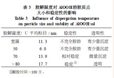 SB 粉胶解温度不仅影响胶解产物的晶态,而且影响SB 分胶解的速率。在n(H+ )/ n(AlOOH)=0. 1 、SB 粉质量分数5 %的条件下,考察了胶解温度对AlOOH 胶体的质点的大小和溶胶稳定性的影响。实验结果见表3 。