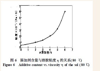 从图6 可以看出,溶胶中加入添加剂后,增加了溶胶的粘度。添加剂质量分数大于3 %时,粘度随添加剂含量增加而急剧增加;当添加剂质量分数为6 %时,与不加添加剂的溶胶相比,粘度增加了15倍。当添加剂质量分数大于3 %时,溶胶在常温下失去流动性,胶凝。这主要是因为加入的添加剂均为高分子化合物,而高分子化合物无法将胶体颗粒表面完全覆盖,胶粒附着在高分子化合物上,发生敏化作用,使颗粒变大,溶胶的流动性变差或胶凝。