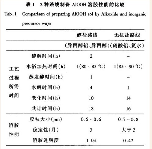 醇盐法能够在较低合成温度下得到具有良好均一性、高纯度的产品,但价格昂贵。无机盐法以硝酸铝和氨水为主要原料,价格低廉,且工艺过程简单,周期短,制备铝溶胶仅需16h。生产应用中采用何种方法还需根据各自特点和需要来决定。