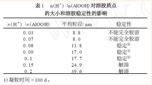 2.1.酸度[以n(H+):n(AlOOH)]表示对AlOOH溶胶质点的大小和稳定性的影响。