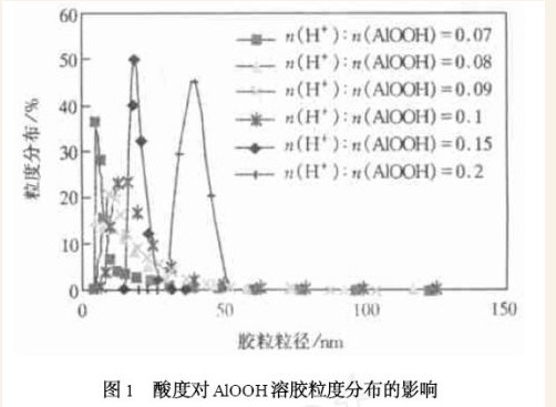 1、胶体的酸度对胶体质点的平均粒径和稳定性均有影响。AlOOH溶胶质点的大小随着酸度的降低先呈下降趋势,之后很快上升。胶体的酸度不同,溶胶的粒度分布也不同,当n(H+):n(AlOOH)=0.07,溶胶粒度分布最窄,胶体的酸度决定了胶体质点的存在形态;酸度降低,SB粉的溶解度提高,在n(H+):n(AlOOH)=0.08~0.1时,AlOOH溶胶稳定;