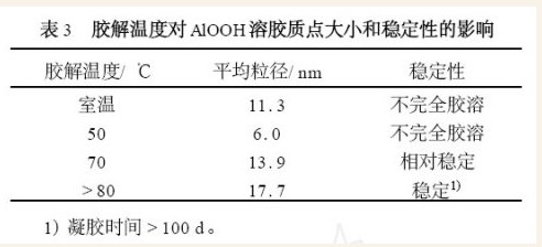 胶解温度一方面影响SB粉胶解产物的晶态,另一方面影响SB粉胶解的速率。在n(H+):n(AlOOH)=0.1,SB粉=5%的条件下,考察了胶解温度对AlOOH胶体的质点的大小和溶胶稳定性的影响,实验结果见表3。