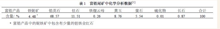 我国铌钽矿储量十分丰富,原矿中常伴有丰富的锆和钍。江西横峰铌钽矿经重选和磁精选后的尾矿中锆钍含量较高 (见表1) 。由于工业生产二氧化锆和锆酸钠等锆产品,要求原料锆英石中ZrSiO4 含量>90 % ,而生产氧氯化锆产品则要求原料锆英石中ZrSiO4 含量更高。而一般富锆尾矿中ZrSiO4 含量远远低于现有的工业生产标准。因此,这些富锆尾矿一直废弃而未加以综合利用。锆是重要的稀有金属,其应用相当广泛,从锆英石中提取锆产品的研究较多。在工业生产上一般采用碱熔法,即用固体烧碱在高温下熔融分解锆英石矿,经过滤、酸化、结晶等多段工序,可生产出不同规格的氧氯化锆产品。若用该法从低品位富锆尾矿中提取锆产品,则原料成本较高。文献报道了用生石灰等廉价原料高温熔融分解锆英石制备二氧化锆的方法。笔者提出了生石灰为主要原料,高温熔融分解富锆尾矿,对从该低品位富锆尾矿中提取氧氯化锆的方法进行了研究,取得了较好的结果。这对于充分利用自然资源,提高矿山的经济效益,具有较大的现实意义。