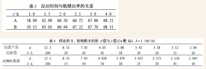 控制反应温度为1 250 ℃,固定富锆矿样、氧化钙粉末与固体烧碱的质量比为1∶1. 2∶0. 2 时,在马福炉中进行不同时间的熔融反应,浸出率与反应时间的关系如表3所示。从表3可知,反应时间不足2 h时,随着反应时间的增长,浸出率增大,当反应时间超过2 h后,反应时间的延长对浸出率的提高影响不大,这说明经2 h 熔融后,反应已进行较完全。