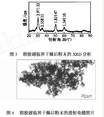 对制备的溶胶进行超临界流体干燥,所得的粉体进行XRD 和TEM 分析(见图3 、图4) 。因为超临界流体干燥能够保持溶胶体系的原始状态,所以干燥后粉体的XRD 和TEM 能够从另一侧面体现胶体的性质。从图3 可以看出,经超临界干燥后的凝胶ZrO2的特征峰比较宽,利用Scherrer 公式计算粉末的粒径为6nm。从TEM 图象(图4) 可以看出粉体的ZrO2颗粒粒径为10nm 左右,颗粒之间有一定的网络结构,这反映了胶体的结构。TEM 观察的粒径比XRD 计算的结果稍大,可能是由于制备透射样品、视场的选择和颗粒大小测量过程中引入的误差所致;或是晶格内存在缺陷造成XRD 峰宽化的结果。