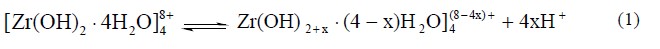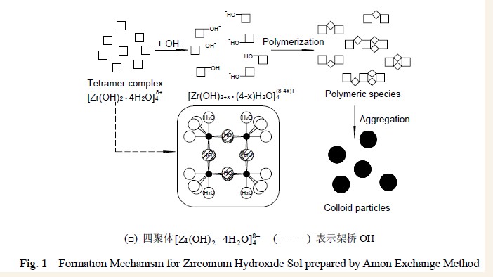 将氧氯化锆配制成溶液时,ZrOCl2·8H2O溶解在水中形成了水合锆离子,其主要形式为[Zr(OH)2. 4H2O] 48+ 四聚体。在每一个四聚体中,4个锆原子以四方形的形式排列,并且每一个锆原子有4个架桥羟基和4个水分子配位。由四聚体中配位水的脱质子作用而释放出H+,其过程可由下式描述: