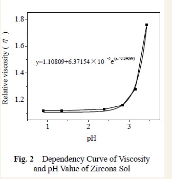 采用离子交换法制备氧化锆溶胶时,阴离子交换树脂作为羟基的供体,在提供羟基的同时从体系中移出等摩尔的Cl。随着离子交换过程的进行,Cl浓度减小、羟基数量增加因而溶液的pH 值逐渐升高,同时溶胶的粘度增加,溶胶的稳定性也发生改变。图2 是氧化锆溶胶的相对粘度与pH 值的变化曲线。由图中可以看出,当溶胶的pH 值小于2.5 时,溶胶的粘度随pH 值变化并不明显,但当溶胶的pH 值大于2.5 以后,溶胶的粘度随其pH 值的增加迅速增大。对图2 中的曲线进行拟合发现,随pH 值的增加,溶胶的粘度基本呈指数增长趋势。
