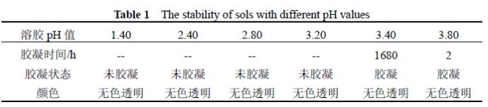 表1为不同pH 值的氧化锆溶胶放置6个月后的溶胶稳定性实验结果。由表1 可见,在溶胶的pH 值小于3.2 时,所制氧化锆溶胶封口放置6 个月仍未见溶胶胶凝。而pH 值为3.4 的溶胶放置2 个多月才胶凝。但是当溶胶的pH 值达到3.8 时,放置2h 后溶胶就胶凝变成无色透明的凝胶而丧失流动性。特别是当溶胶的pH 值达到4 左右时,制备过程中即发生胶凝现象,不能得到稳定的溶胶。