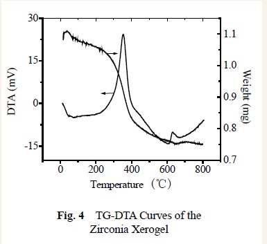 图4 是经90℃干燥24h 的氧化锆干凝胶的TG-DTA 曲线。在TG 曲线上有3 个失重阶段:250℃之前的失重主要为表面吸附水的挥发所致;250℃到400℃的失重对应于非架桥羟基和架桥羟基的脱水以及部分配位水的脱除;400℃至650℃的失重对应于干凝胶中残留的架桥羟基进一步脱水;650℃之后,TG线趋向平稳,样品组成和结构趋于稳定。与TG 曲线相对应,DTA 曲线上250℃之前的宽吸热峰是由于表面吸附水的挥发所致;在DTA 曲线上350℃处有一强放热峰,它是由于氧化锆凝胶由非晶态向晶态氧化锆转变过程中放热所致,这也可由干凝胶的XRD 谱图 (图5) 得到进一步证明;而在630℃处的小的放热峰并没有明显的失重与之对应,因此可认为此放热峰是氧化锆由四方相向单斜相的相转变引起的。