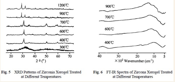 摘要:以氧氯化锆为原料,采用离子交换法制备氧化锆溶胶。考察了制备过程中pH值对溶胶稳定性的影响,探讨了溶胶形成机理。应用TEM对所制溶胶胶粒形貌、粒径进行了分析,采用TG、DTA、XRD、FTIR 等测试手段分析了干凝胶的热稳定性和结构变化。结果表明,离子交换法是制备氧化锆溶胶的简单、有效方法,所制的溶胶无色透明,稳定性好。氧化锆干凝胶在400℃~600℃为四方相,从700℃开始有少量单斜相出现。