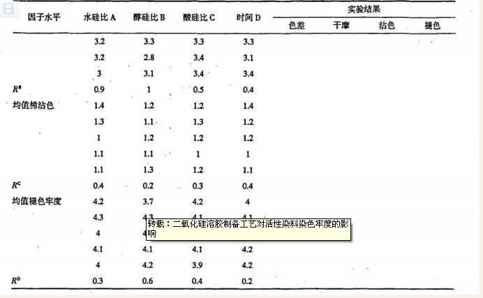 二氧化硅溶胶的制备工艺有待于进一步确定. 由正交实验得出二氧化硅溶胶制备的最佳工艺: 水硅比为4 ; 醇硅比为5 ; 酸硅比为0.02 ; 放置时间为4 h , 在实验中发现水硅比越小其色差越小,各项牢度也趋于变好,但水的量太少容易使得正硅酸乙醋不能充分水解,使得制备的溶胶不纯,同时一些研究也表明水硅比在4 时其稳定性最好,因此本实验取得水硅比的值为4 . 按此工艺制备的二氧化硅溶胶用于活性染料固色取得的效果最好.